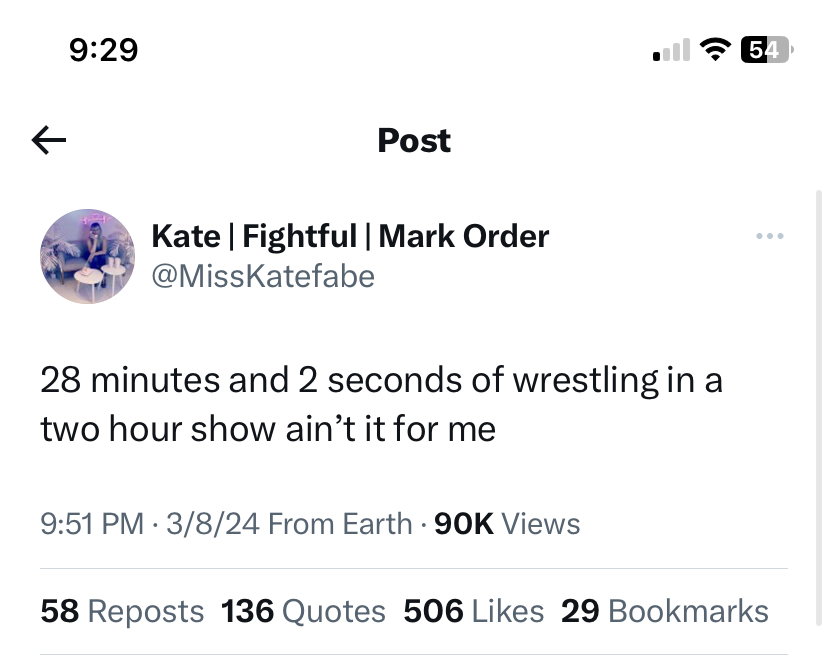 Kate from Fightful posted that a 2 hour episode of Smackdown had 28 minutes and 2 seconds of wrestling and that isn’t what she is looking for in a professional wrestling show. This kicked off 153 replies, 136 quotes, and god knows how many screenshots posted. A majority of what I could see were WWE fans having a very negative response to what in my eyes is a fairly innocuous tweet.